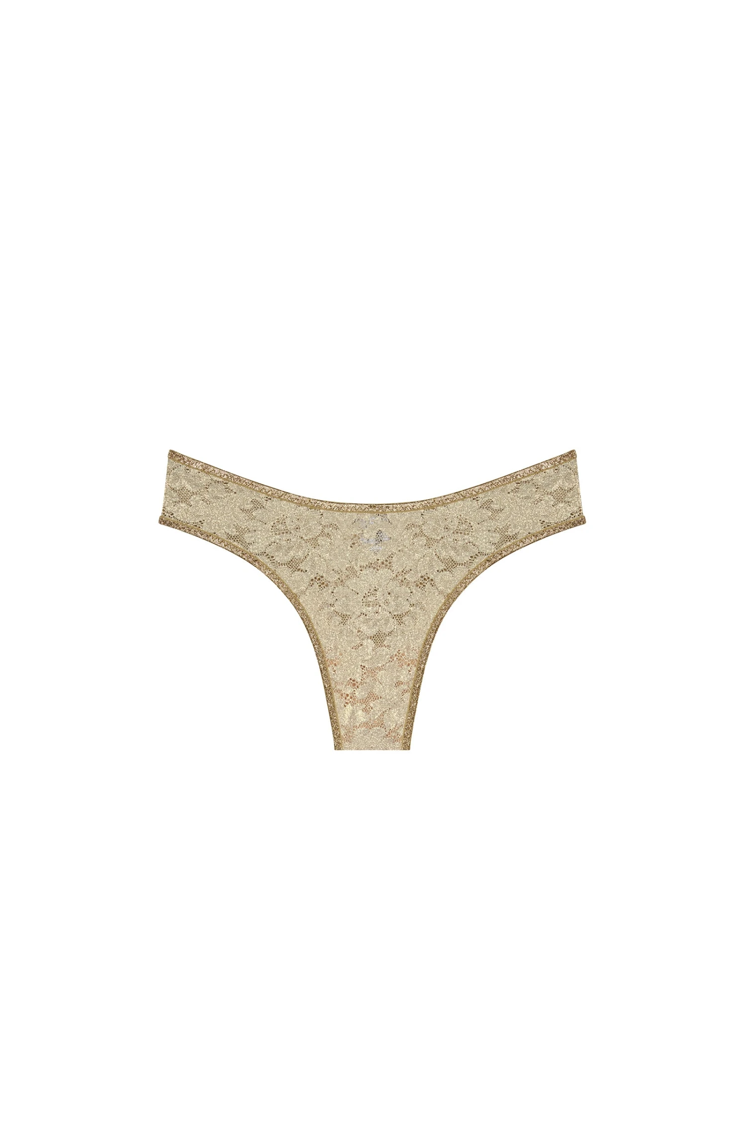 La brassière BERILDA répond à nos envies en se parant de lurex pour nous faire rayonner. Pour un style plus romantique, on choisit le bandeau ALY sable doré. On twiste nos hauts dorés avec des pièces sophistiquées en dentelle noire : l’irrésistible string ELIKA, l’intemporelle culotte TOYA ou le shorty DYLAN dont la bordure en lurex souligne notre taille.