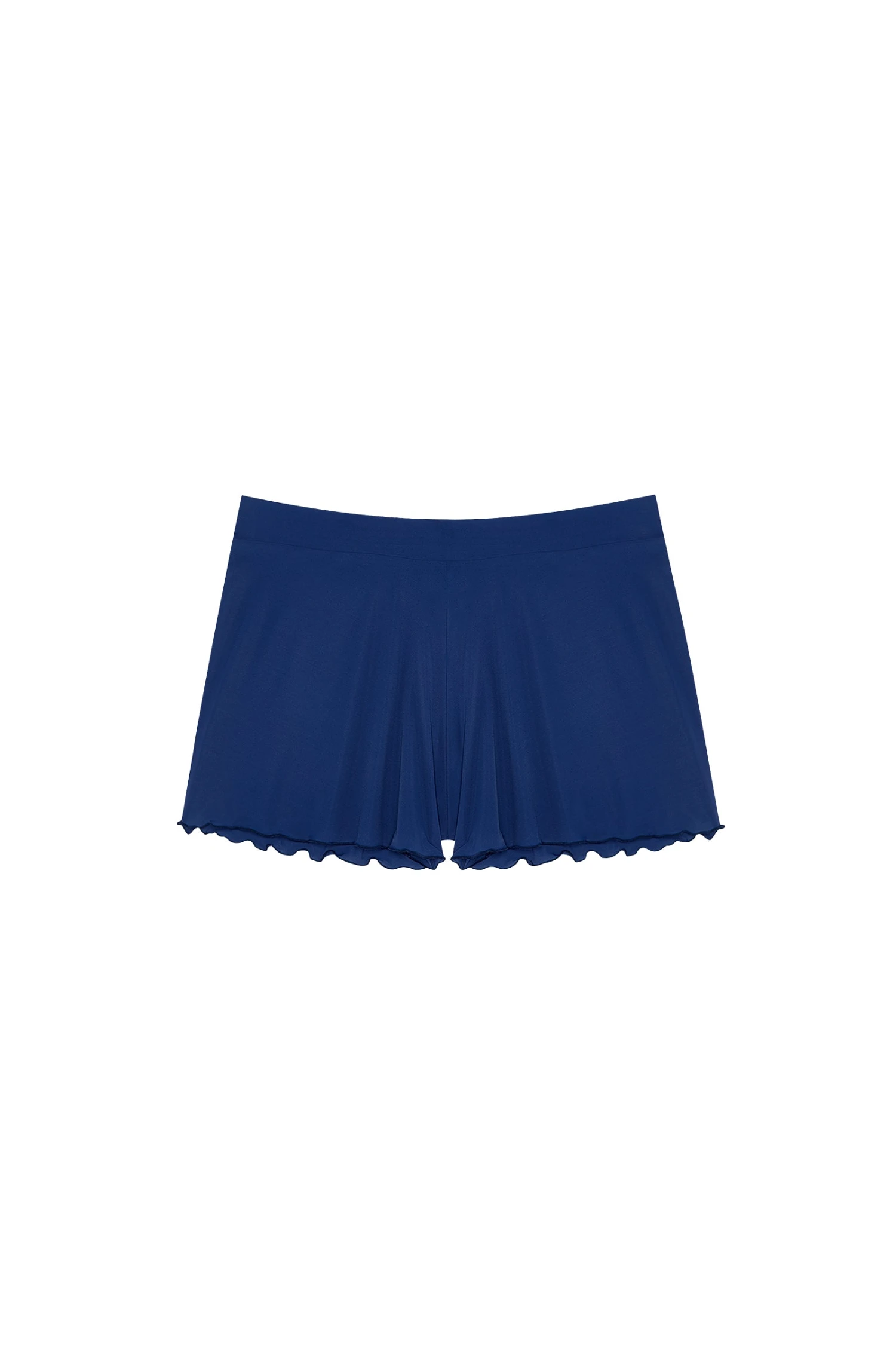 Short évasé en voile léger. Large bande à la taille. Finition bourdon sur le bas.