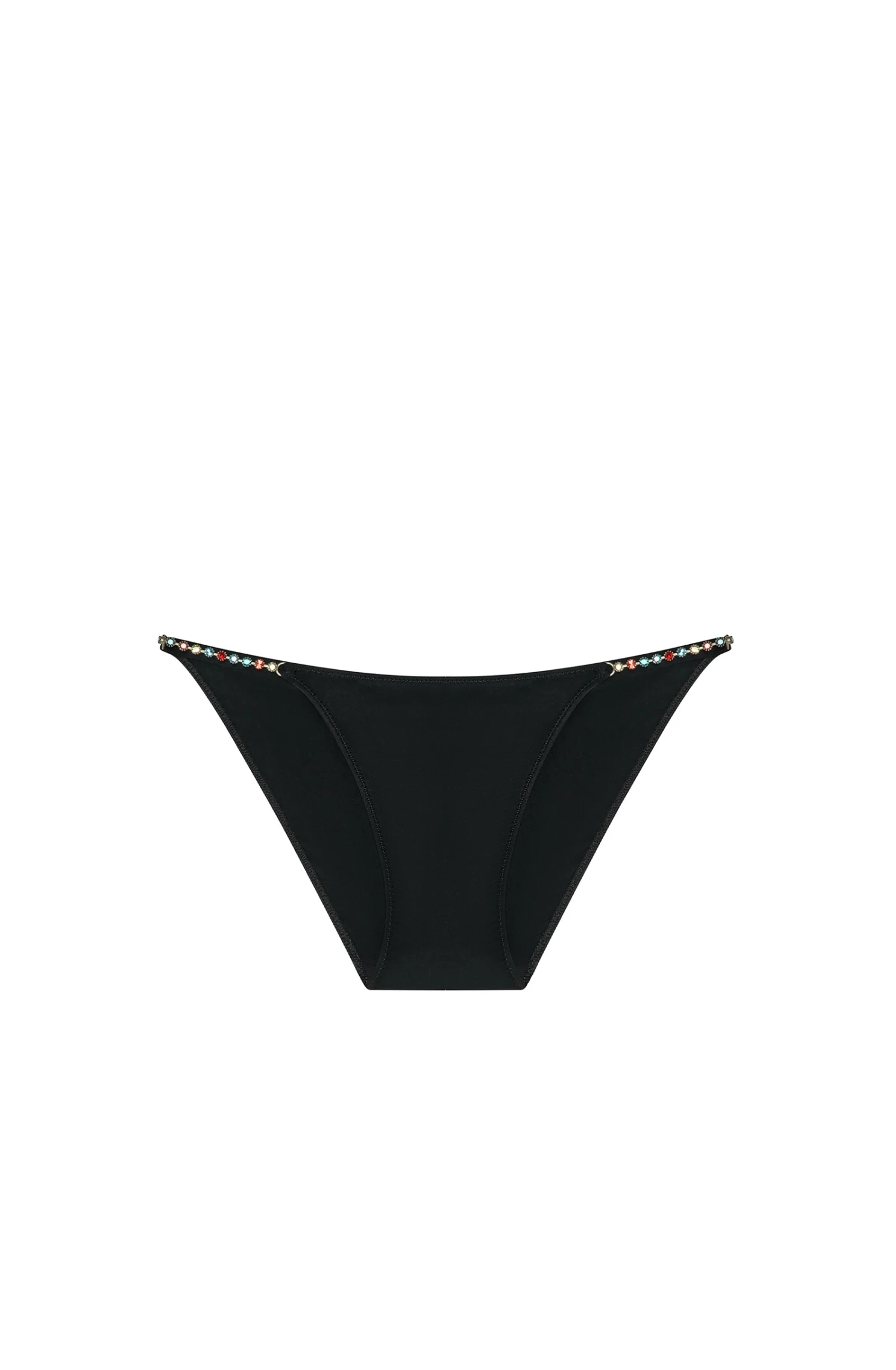 Bas de maillot culotte échancrée à bijoux. Ligne de strass ronds multicolores sur monture argent, superposée à un lien de sûreté et de confort en micro fibre, de chaque côté. Doublé devant.