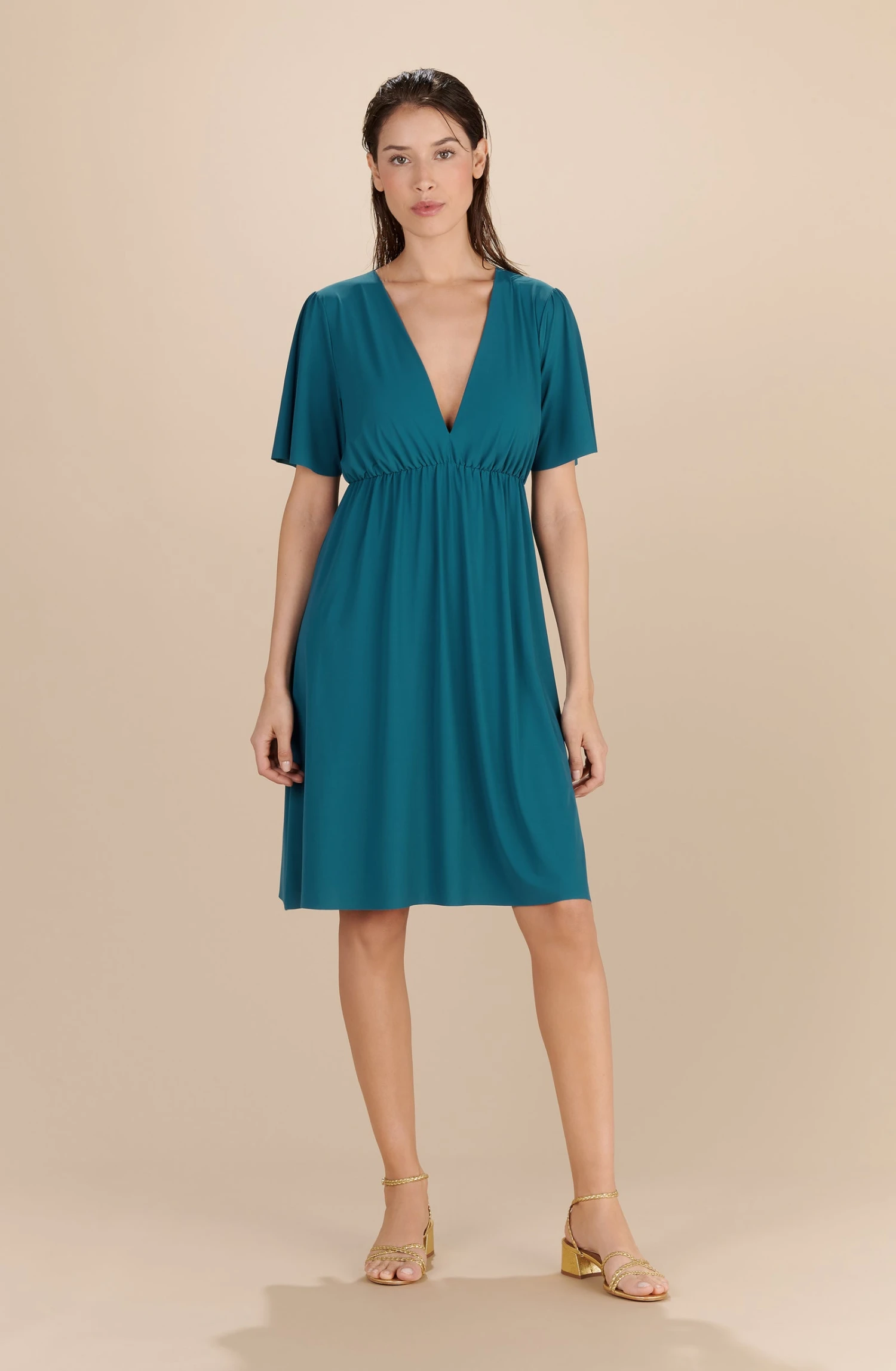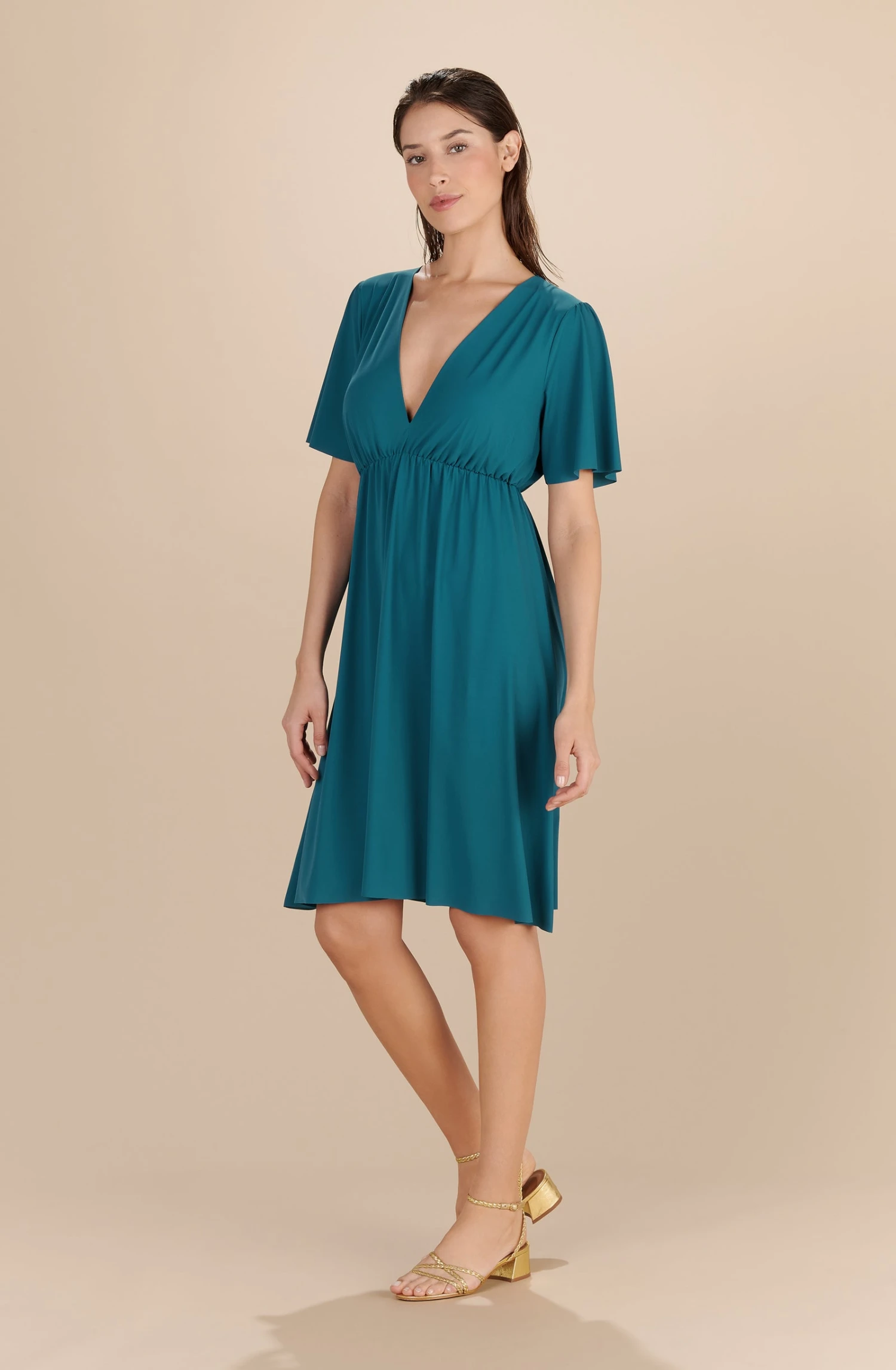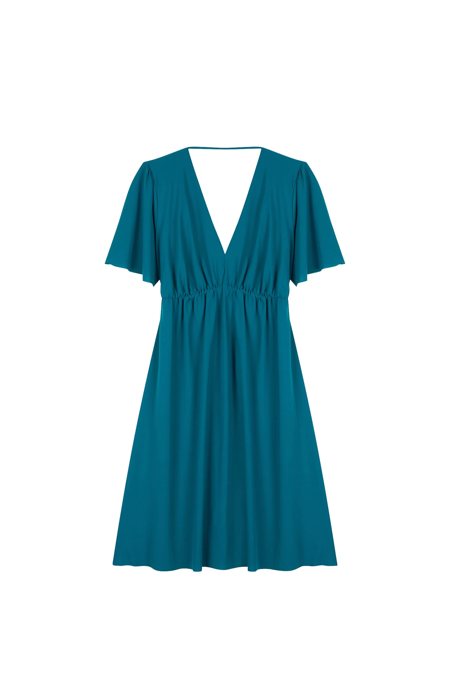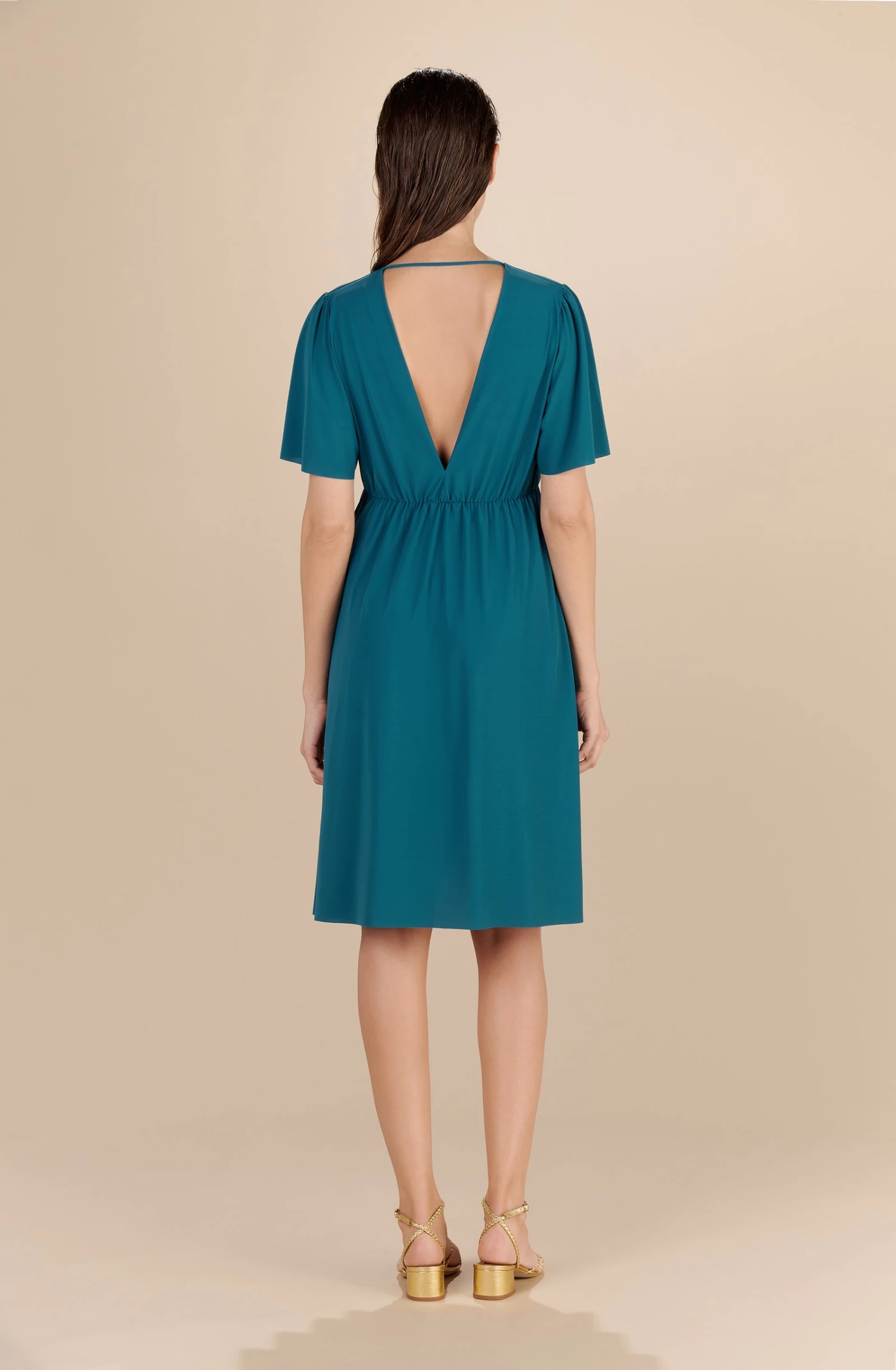 Robe évasée, manches amples, décolleté V plongeant devant et dos. Lien de maintien aux épaules, froncé sous la poitrine.