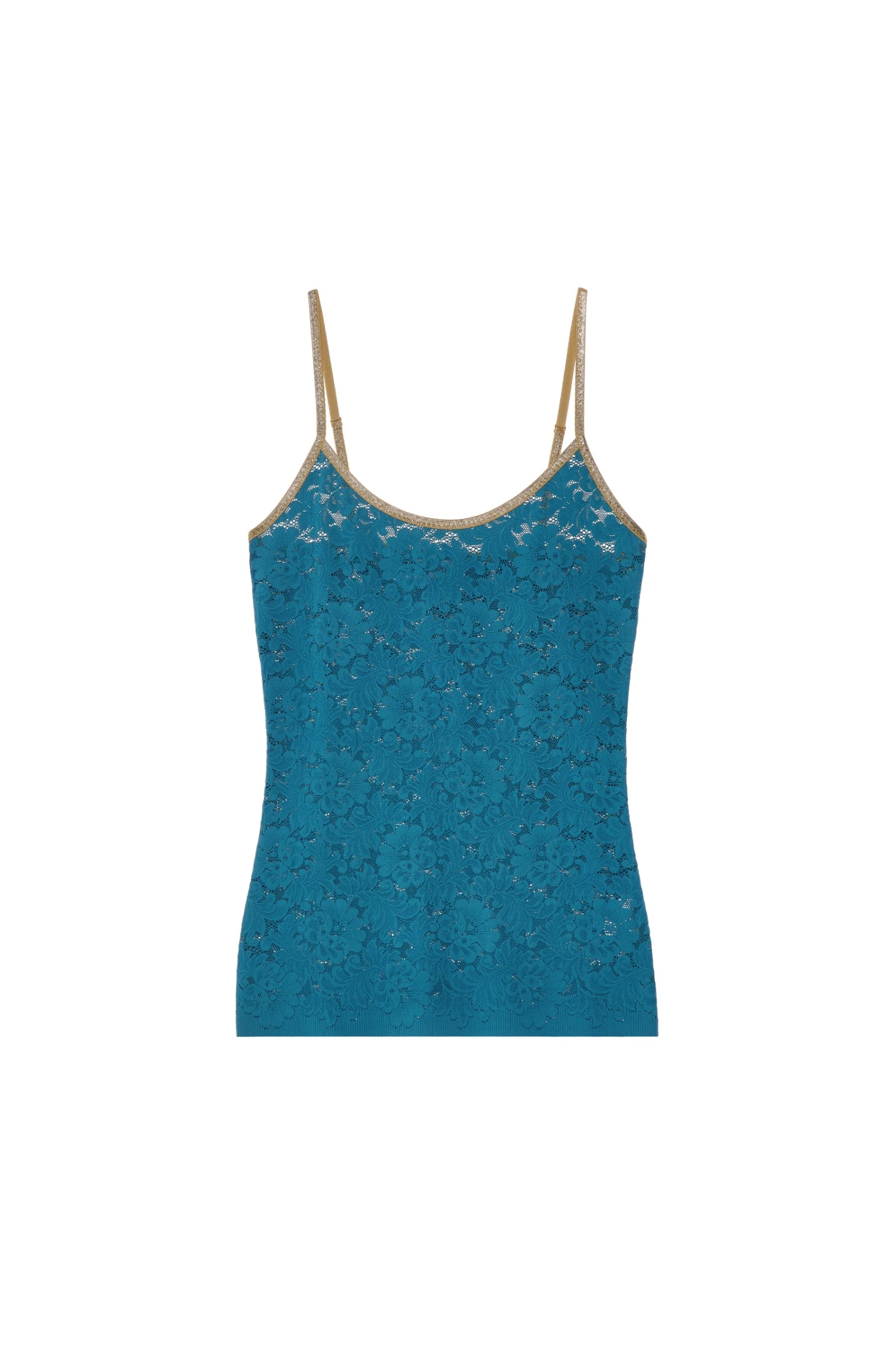 Top en dentelle, encolure en finition dorée et bretelles réglables. Dentelle française.