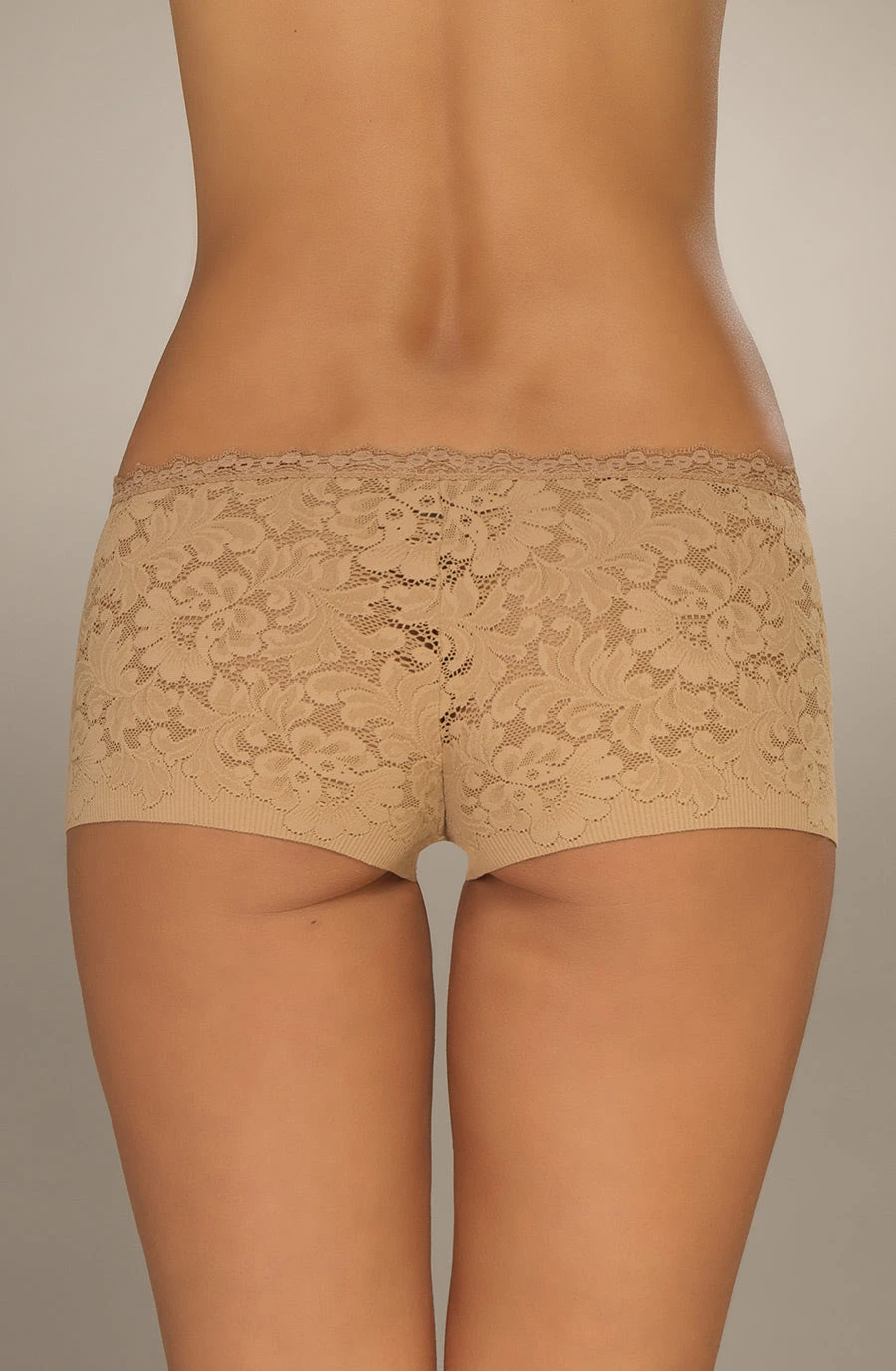 Shorty taille basse en résille de dentelle biscuit. Finition frise de dentelle en tour de taille.