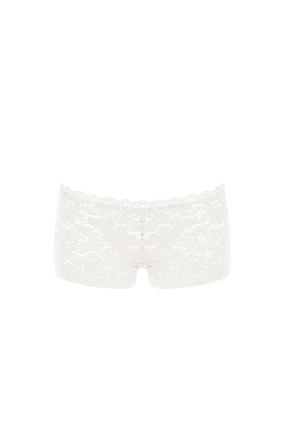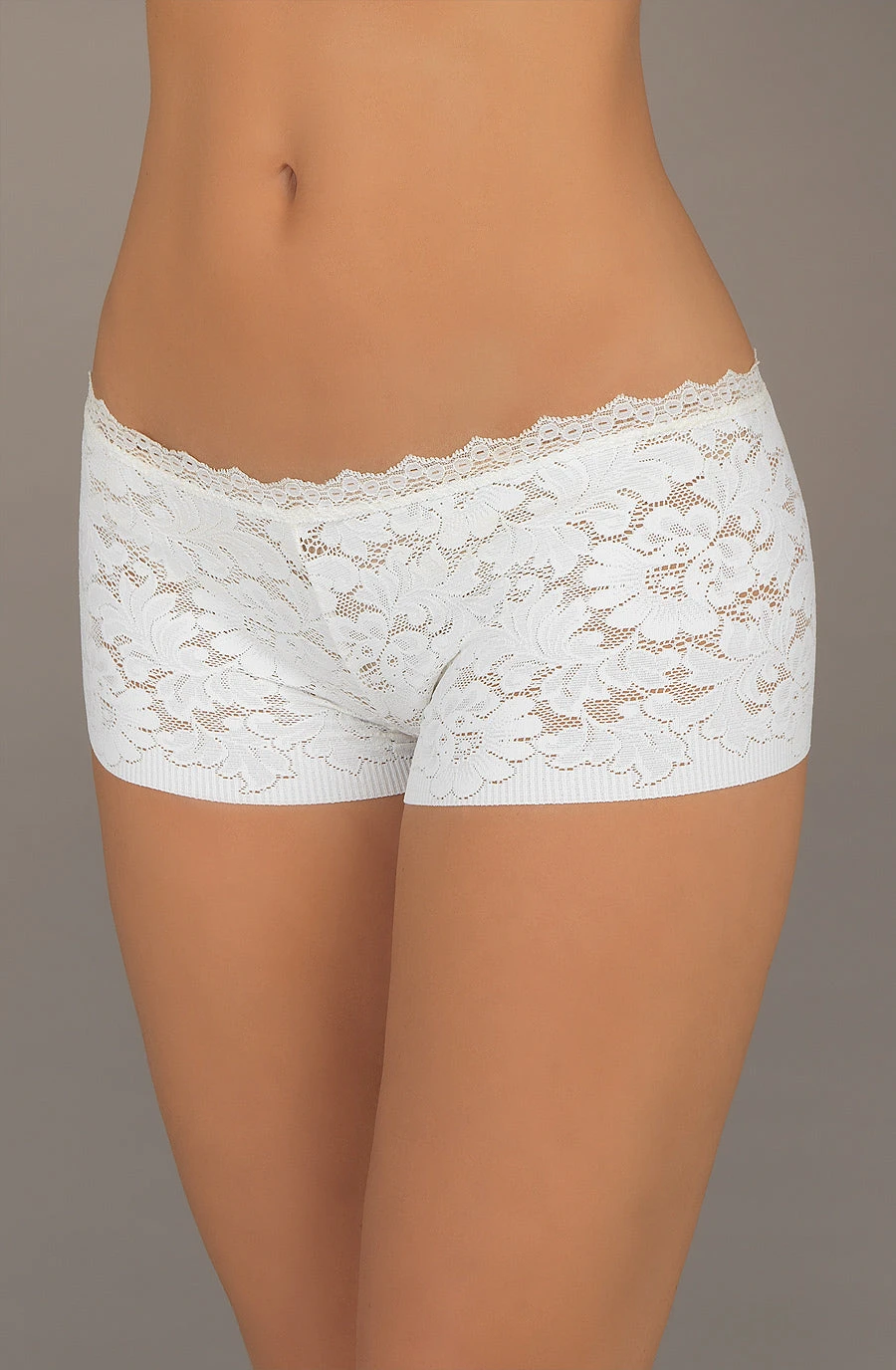 Shorty taille basse en résille de dentelle blanc écume. Finition frise de dentelle en tour de taille.