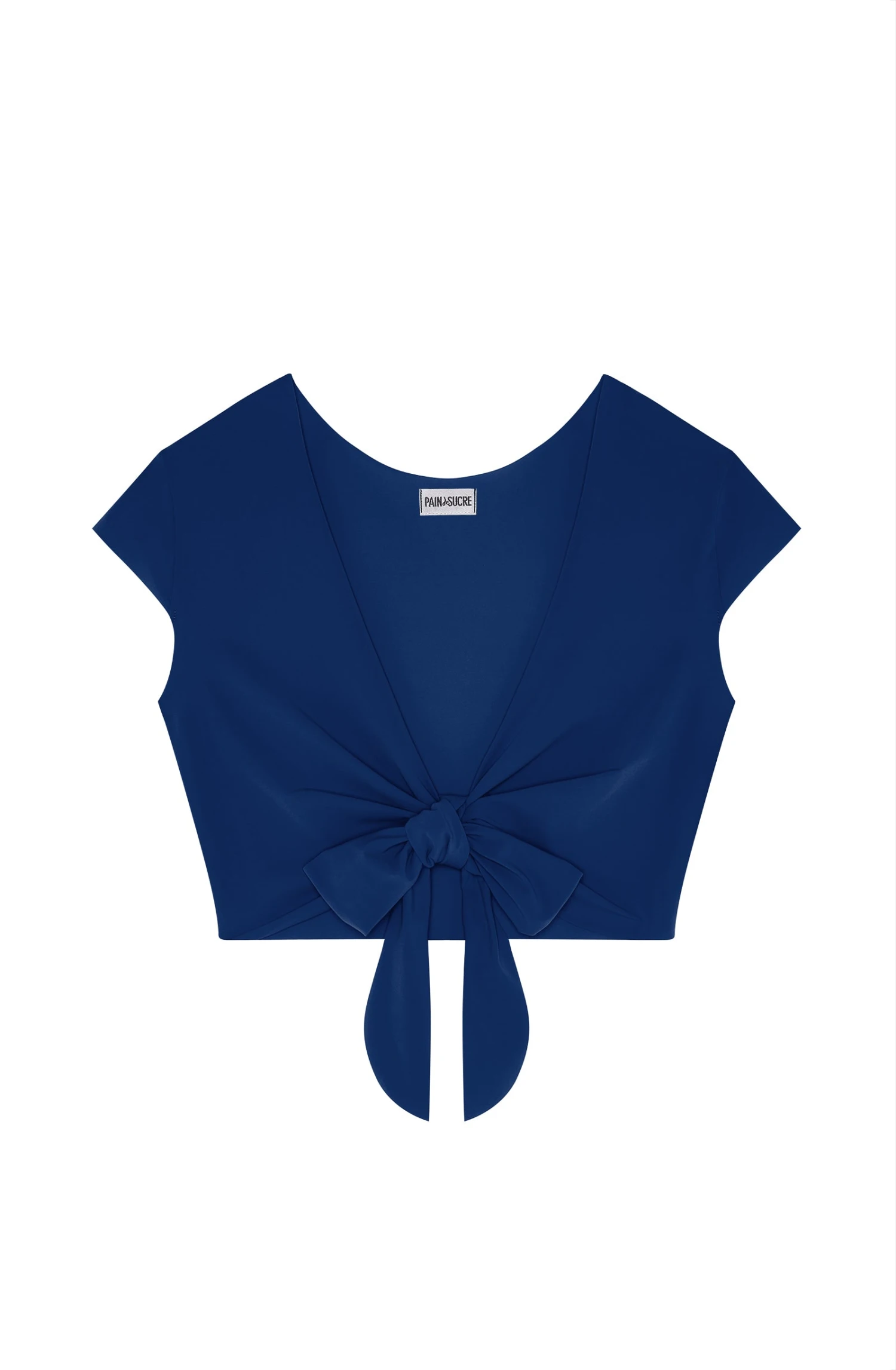 Crop-top cache-coeur à petites manches couvrant les épaules. À nouer devant ou dos. Découpes free-cut. Se porte recto-verso.