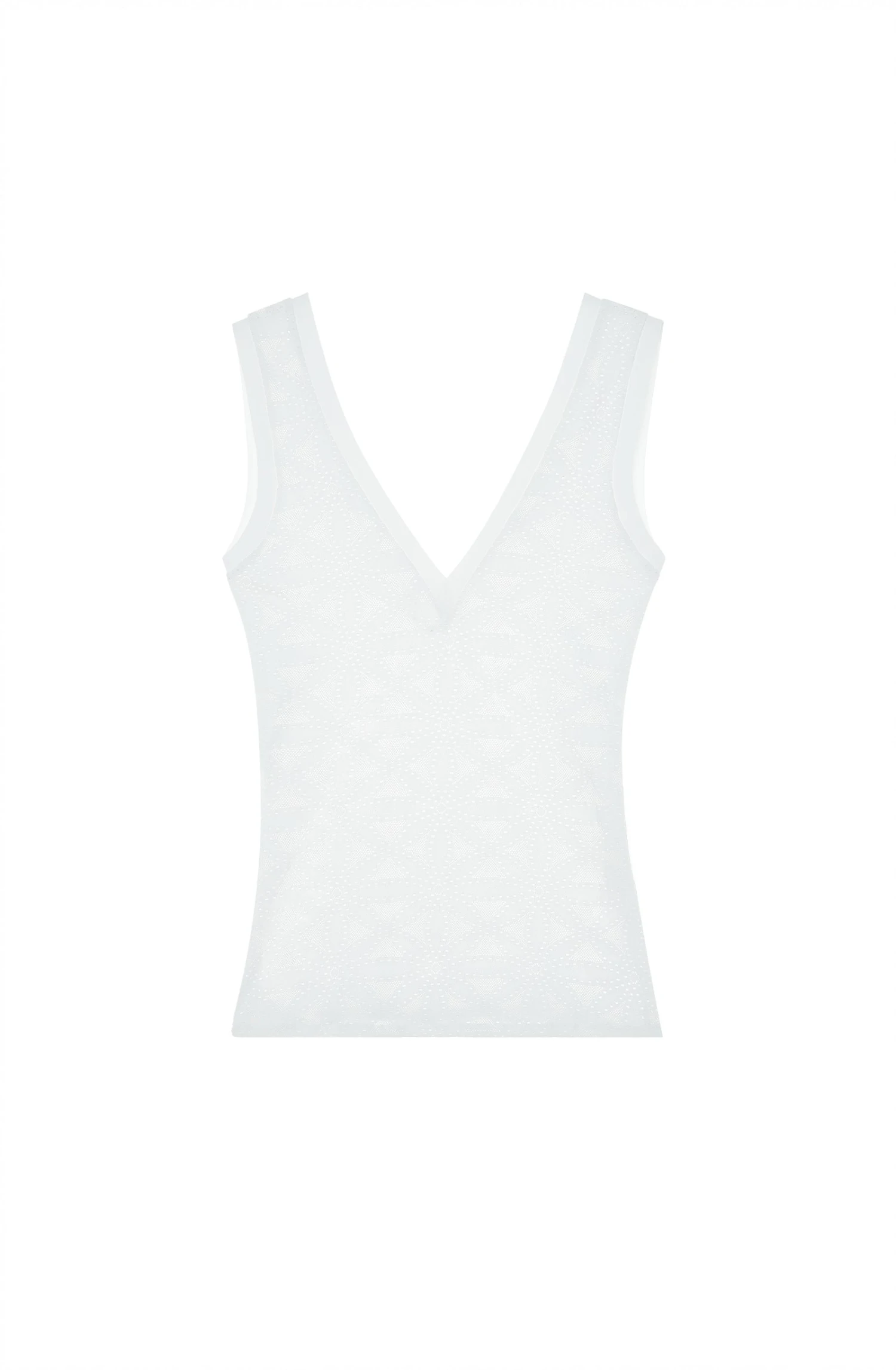 Subtilement ajouré, le top sans manches THAYS laisse deviner des rosaces graphiques inspirées des détails architecturaux d’Aruba. Ce top ajusté forme débardeur est rehaussé d’une matière bonded au niveau du décolleté en V et des emmanchures. Un blanc pur et lumineux.