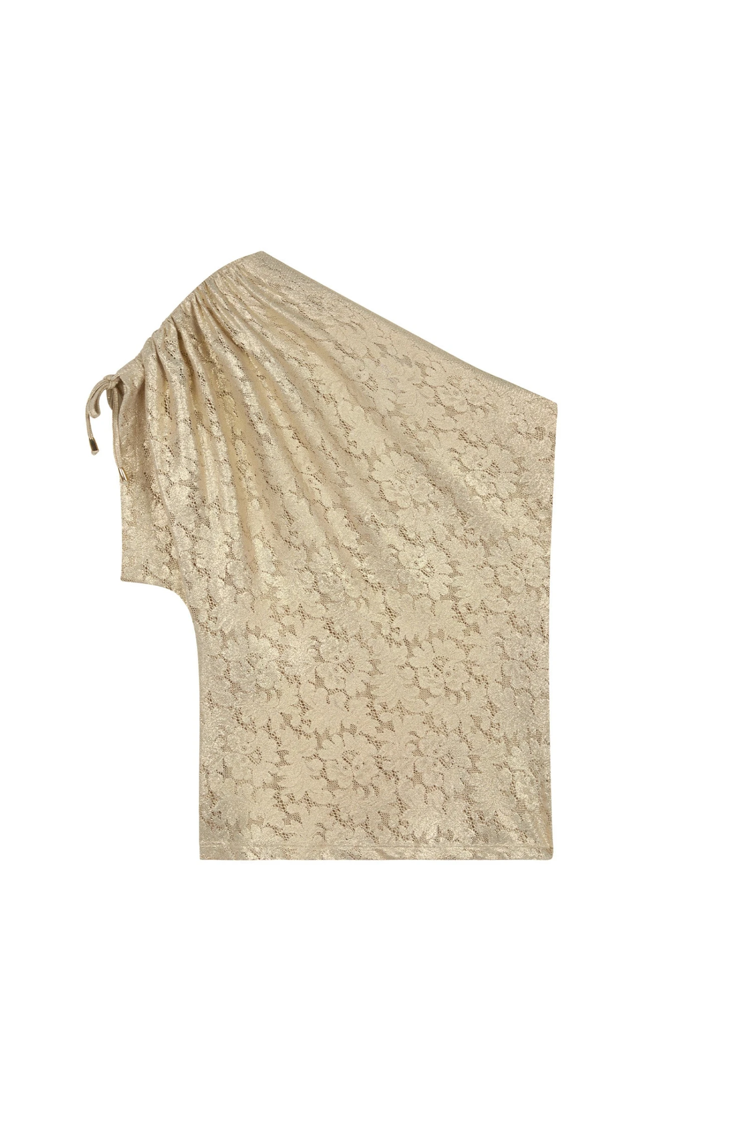Top asymétrique, manche ample, lien coulissant sur l’épaule avec embouts dorés, dentelle laquée or.