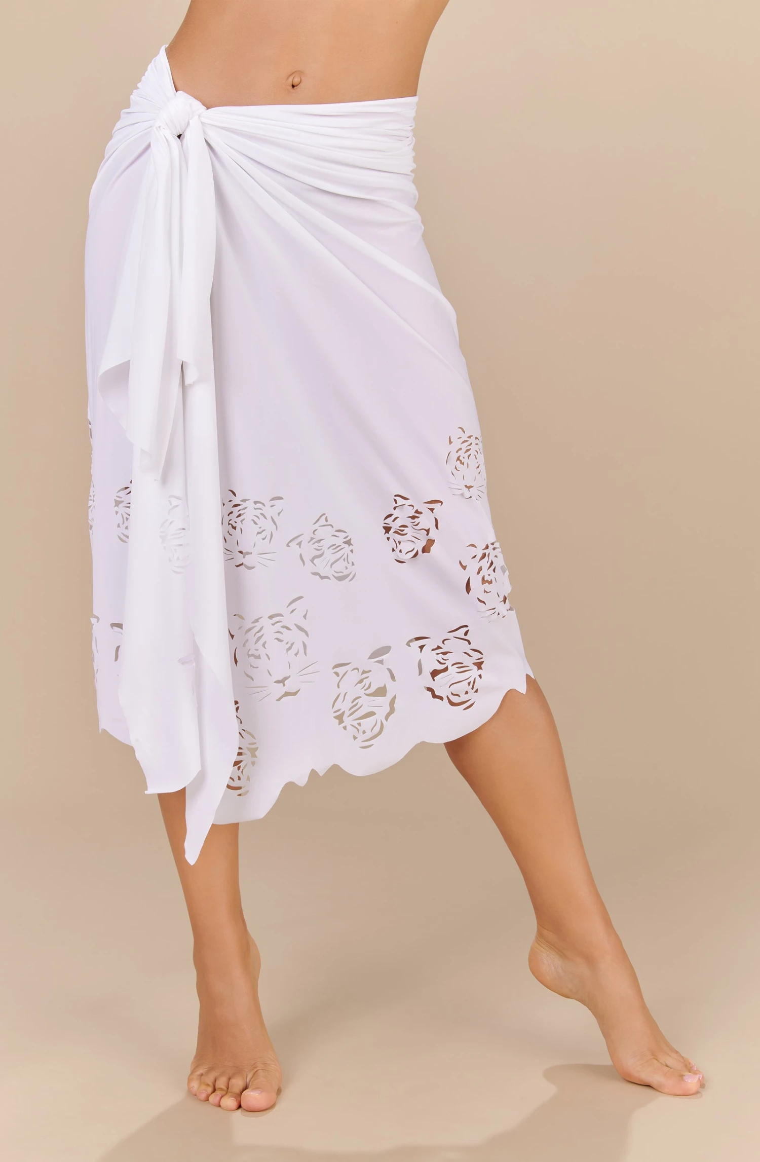 Long paréo 140 x 100 cm en voile léger. Découpes laser motif têtes de tigre sur le bas. Découpe pour l’attache. Différentes possibilités de le nouer. Finitions découpe free-cut.
