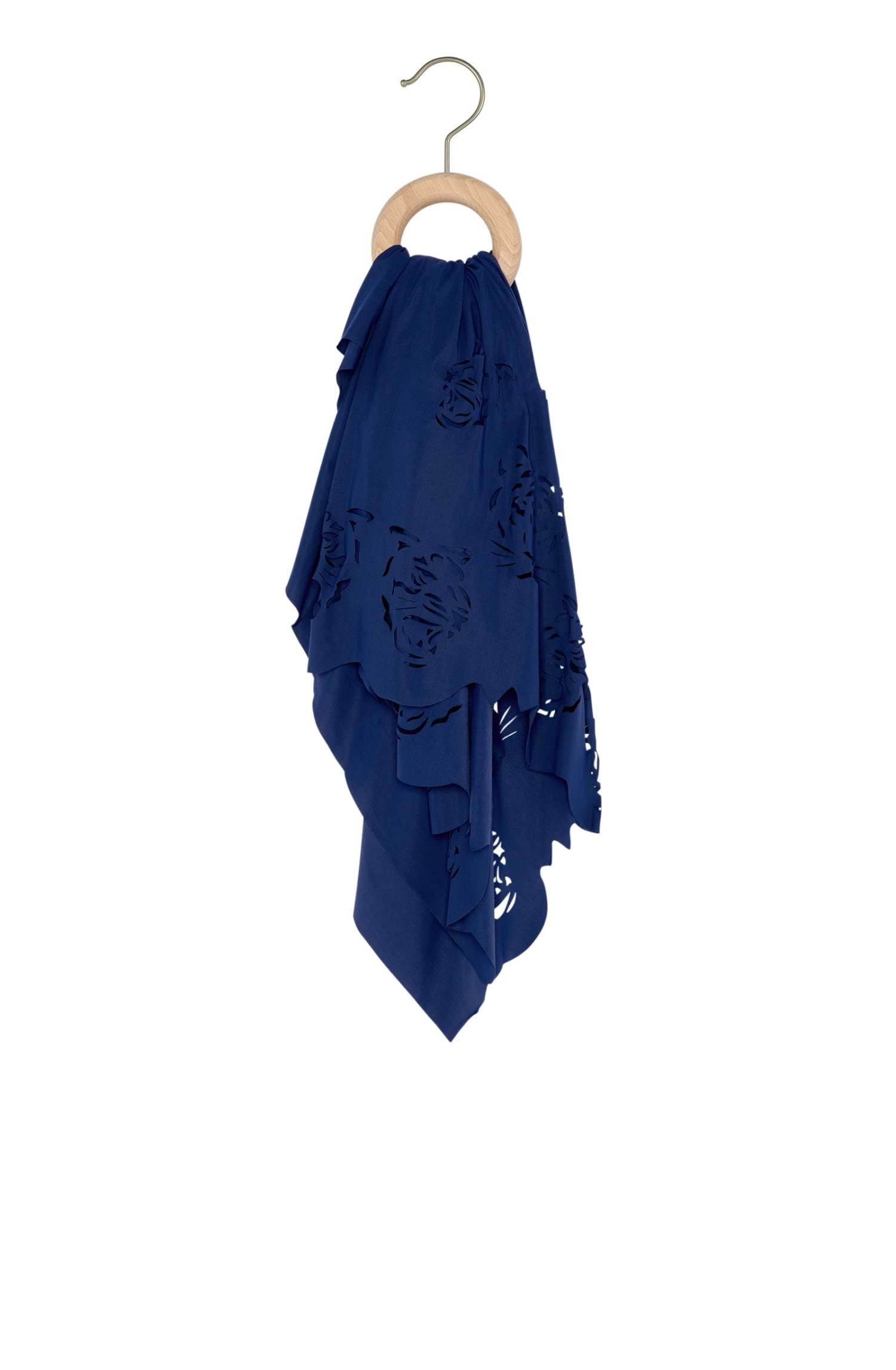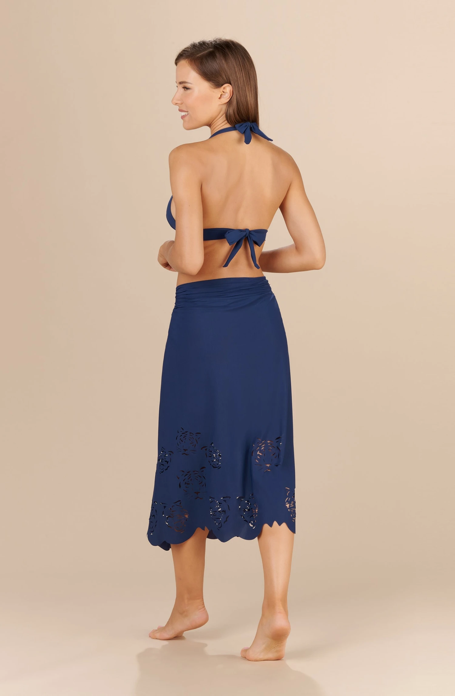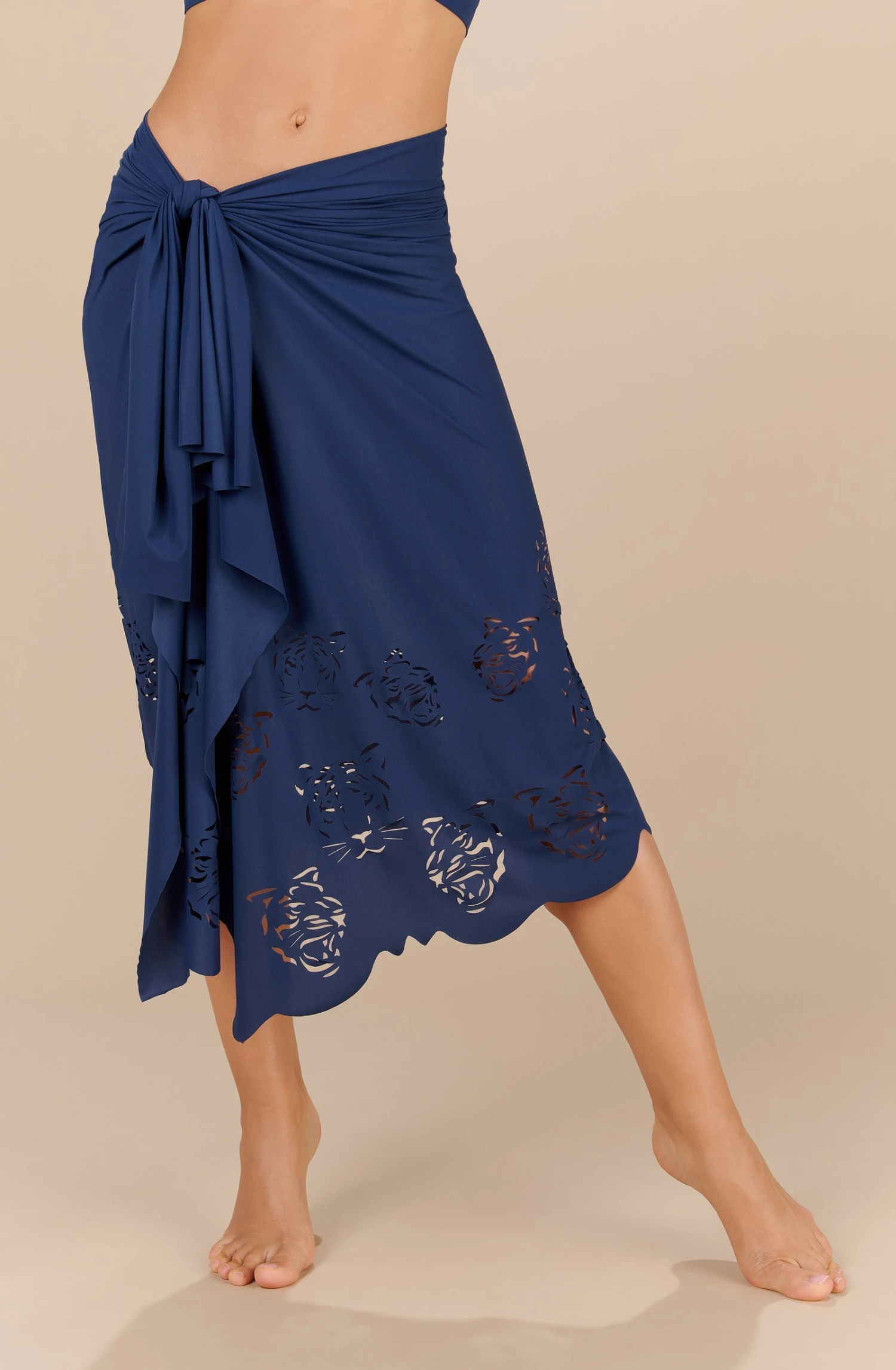Long paréo 140 x 100 cm en voile léger. Découpes laser motif têtes de tigre sur le bas. Découpe pour l’attache. Différentes possibilités de le nouer. Finitions découpe free-cut.
