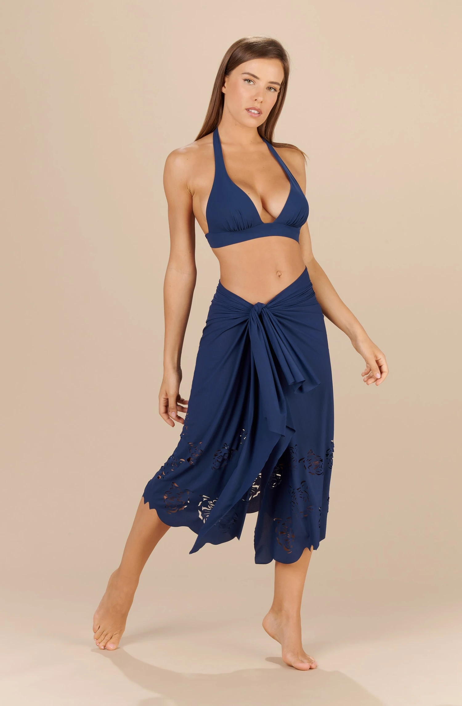 Notre paréo se noue en fonction de nos maillots avec un charme fou. On le porte autour de la taille, version jupe, pour laisser la vedette au superbe maillot une pièce BONNIE nuit. On le noue en robe avec un deux pièces assorti : le string à volants ALALA coordonné au haut à armatures CAMELIA. Plus lumineux et coloré, on aime l’accord avec l’imprimé LIDO du duo DONIA un push-up qui donne du volume à notre décolleté et DIVA une culotte de bain à nouer.