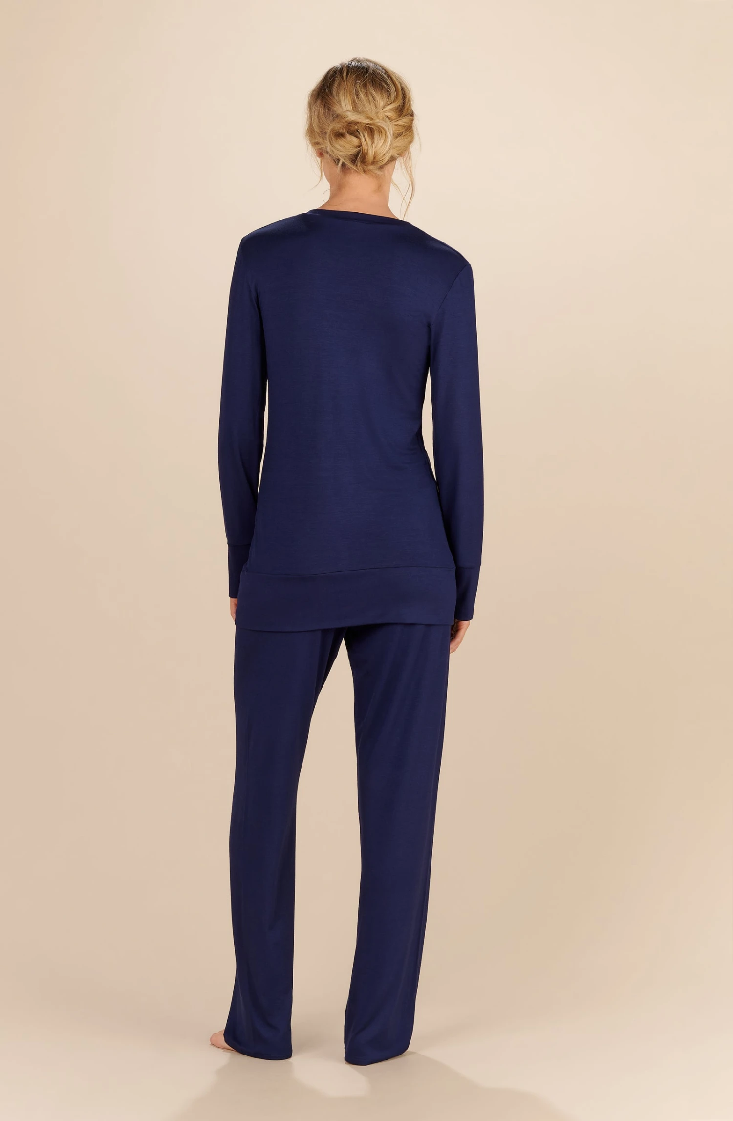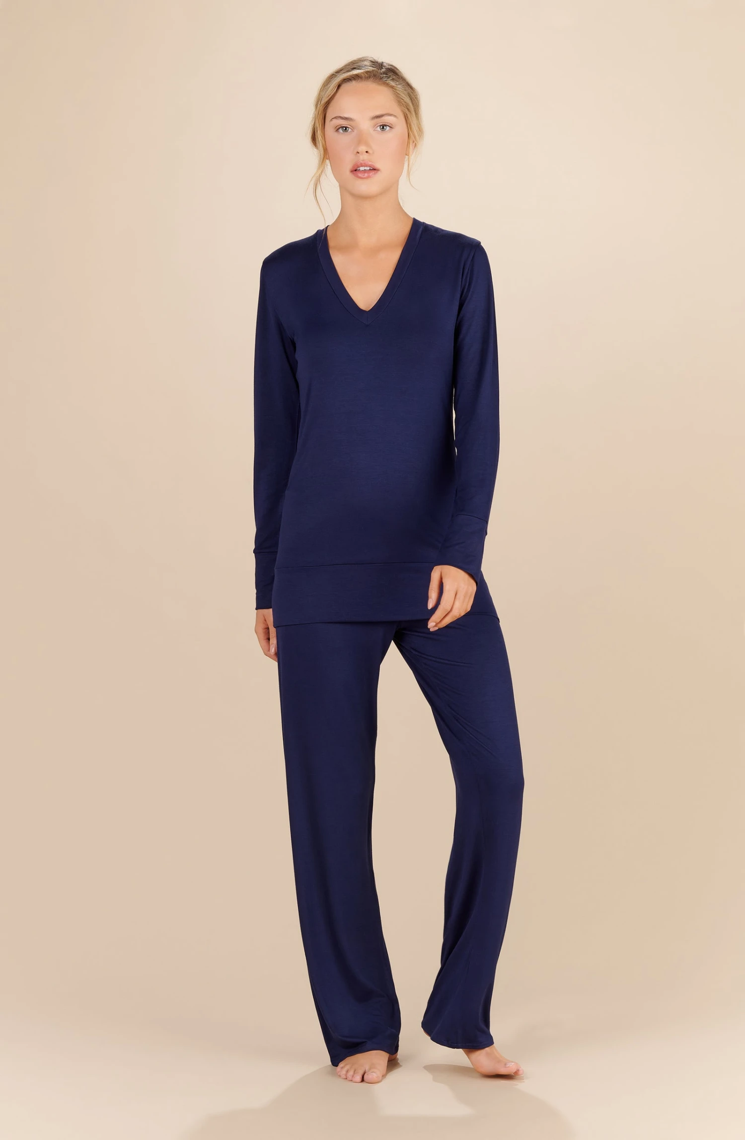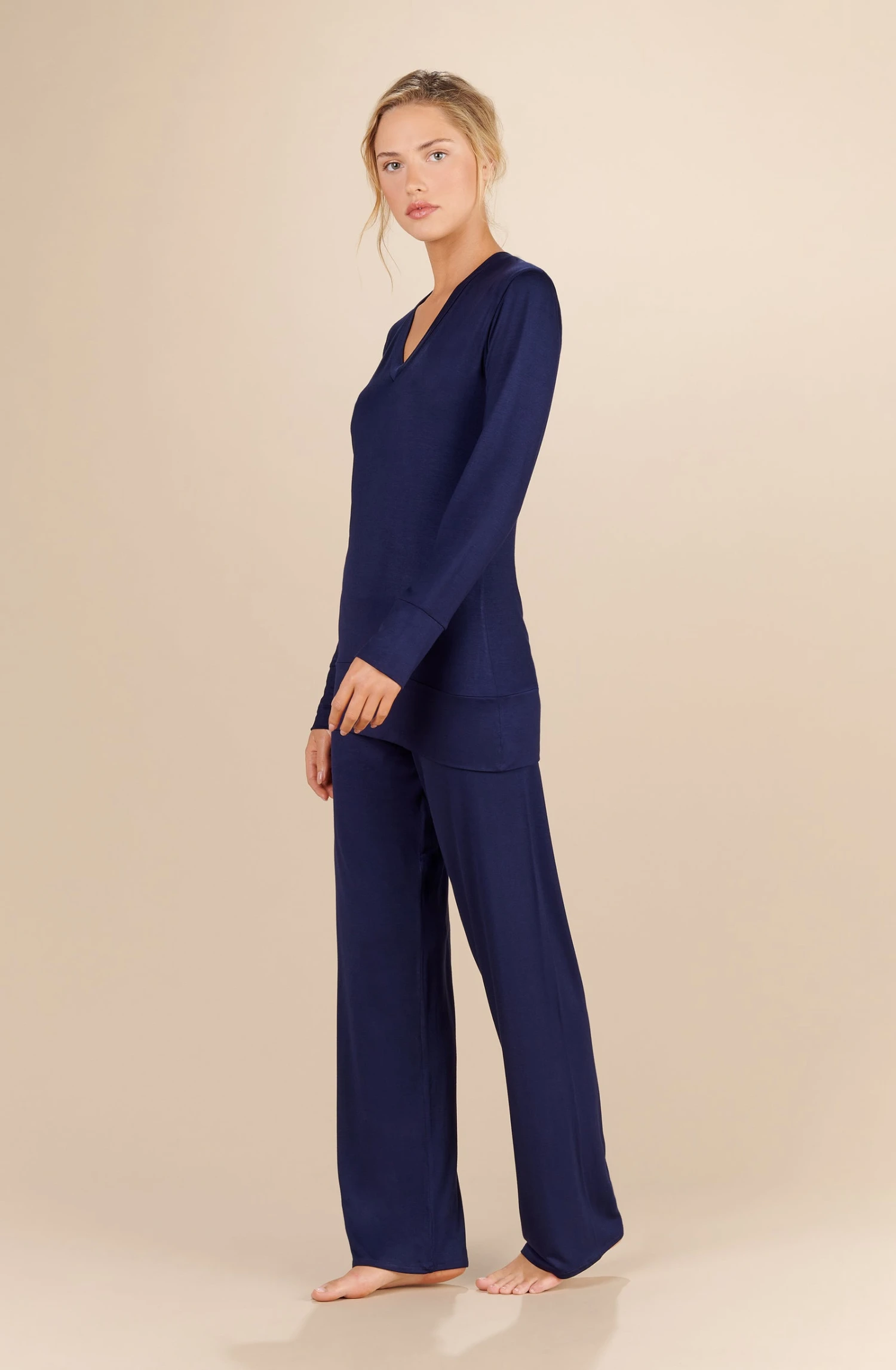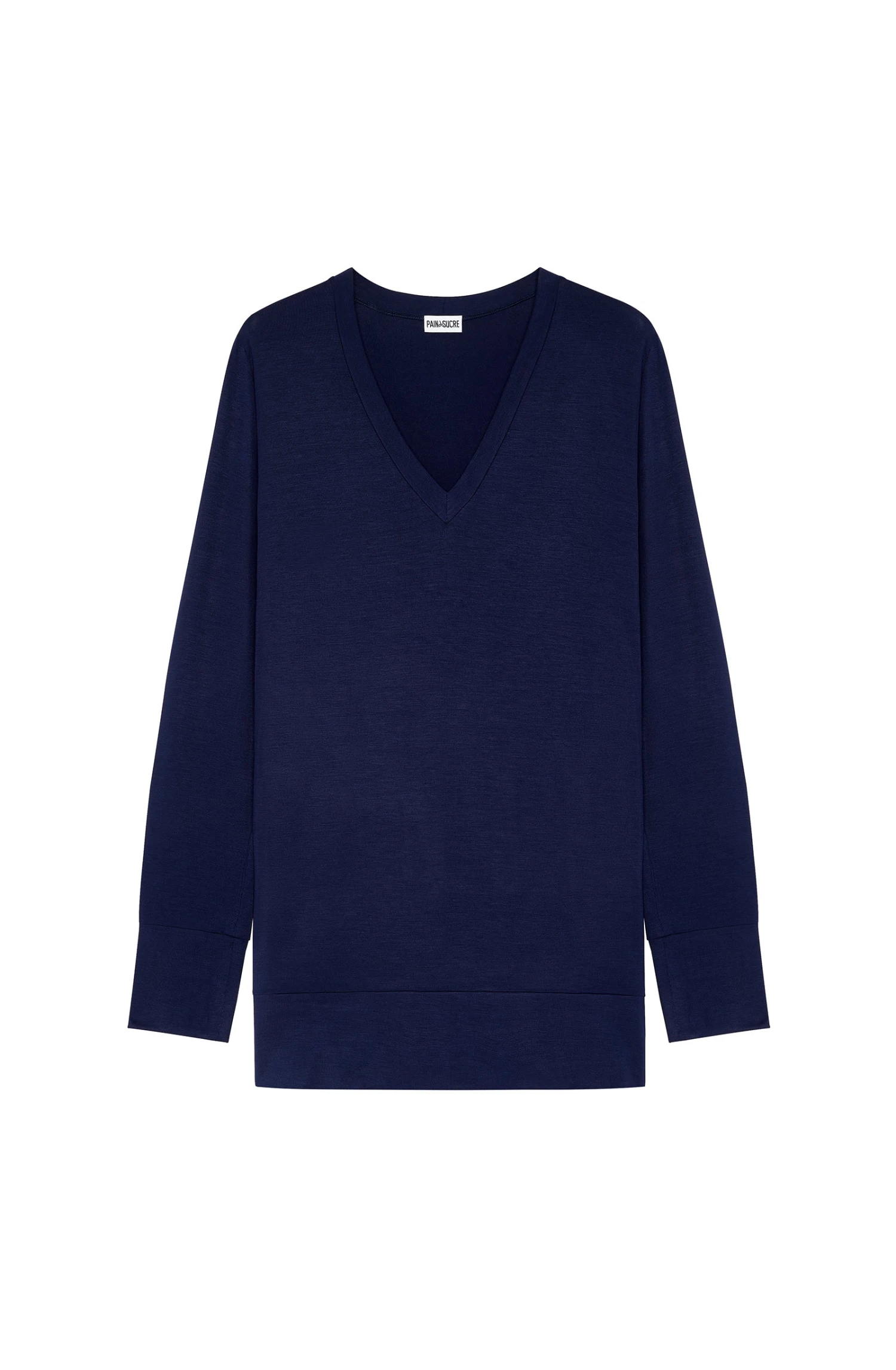 Top décolleté V, manches longues, large bas de manches doublées. Matière ultra douce et légère.