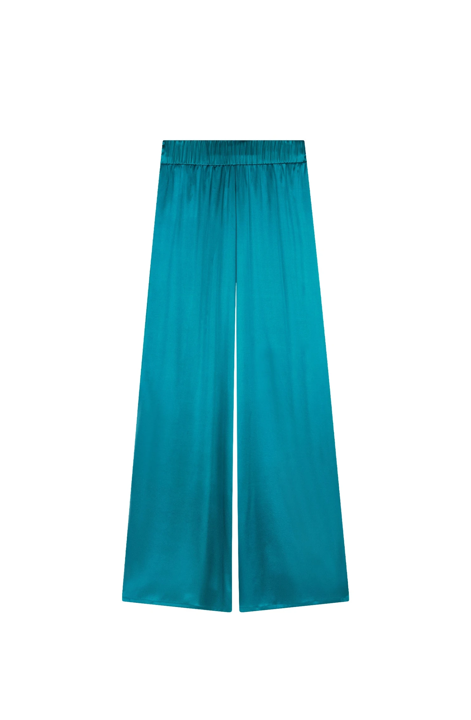 Pantalon large en soie stretch. Taille froncée avec un élastique.