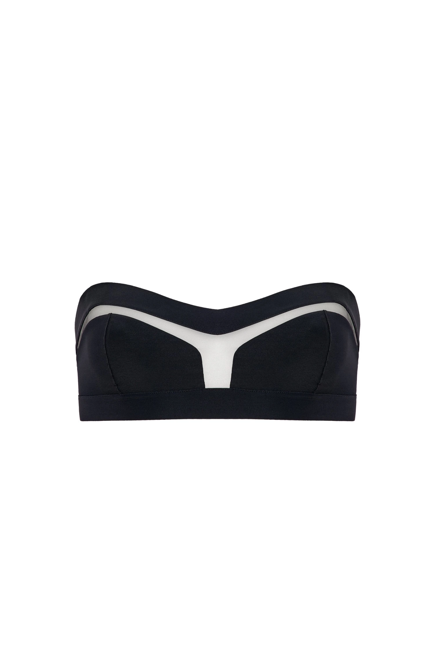 Haut de maillot bandeau. Ajouré sur le haut de la poitrine et l’entre-seins avec un tulle semi-transparent noir. Finition bande en « bonded » free-cut haut et bas du tour de buste. Fermeture crochet-clip dos en zamac argenté. Jeu de bretelles amovibles avec embouts de finition argentés. Sans coque, matière souple.