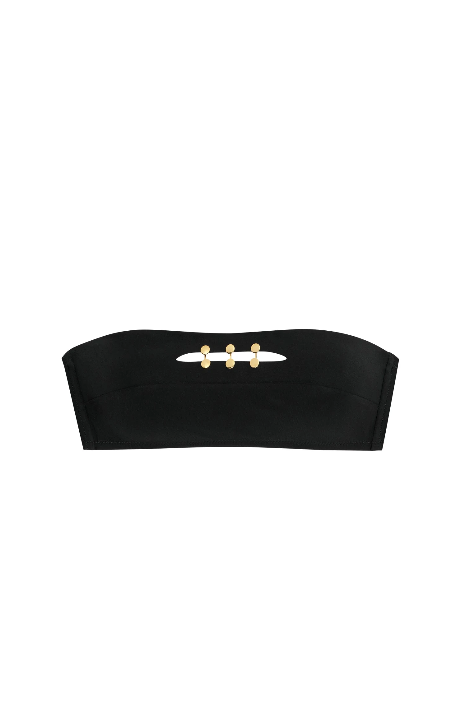 Haut de maillot bandeau ajouré. Empiècement haut bandeau en « bonded » free-cut. Découpe fermée par 3 boutons de manchettes-barrettes amovibles et réversibles en zamac doré. Baleines de maintien sur les côtés. Fermeture dos crochet-clip en zamac doré. Jeu de bretelles amovibles. Doublé devant.