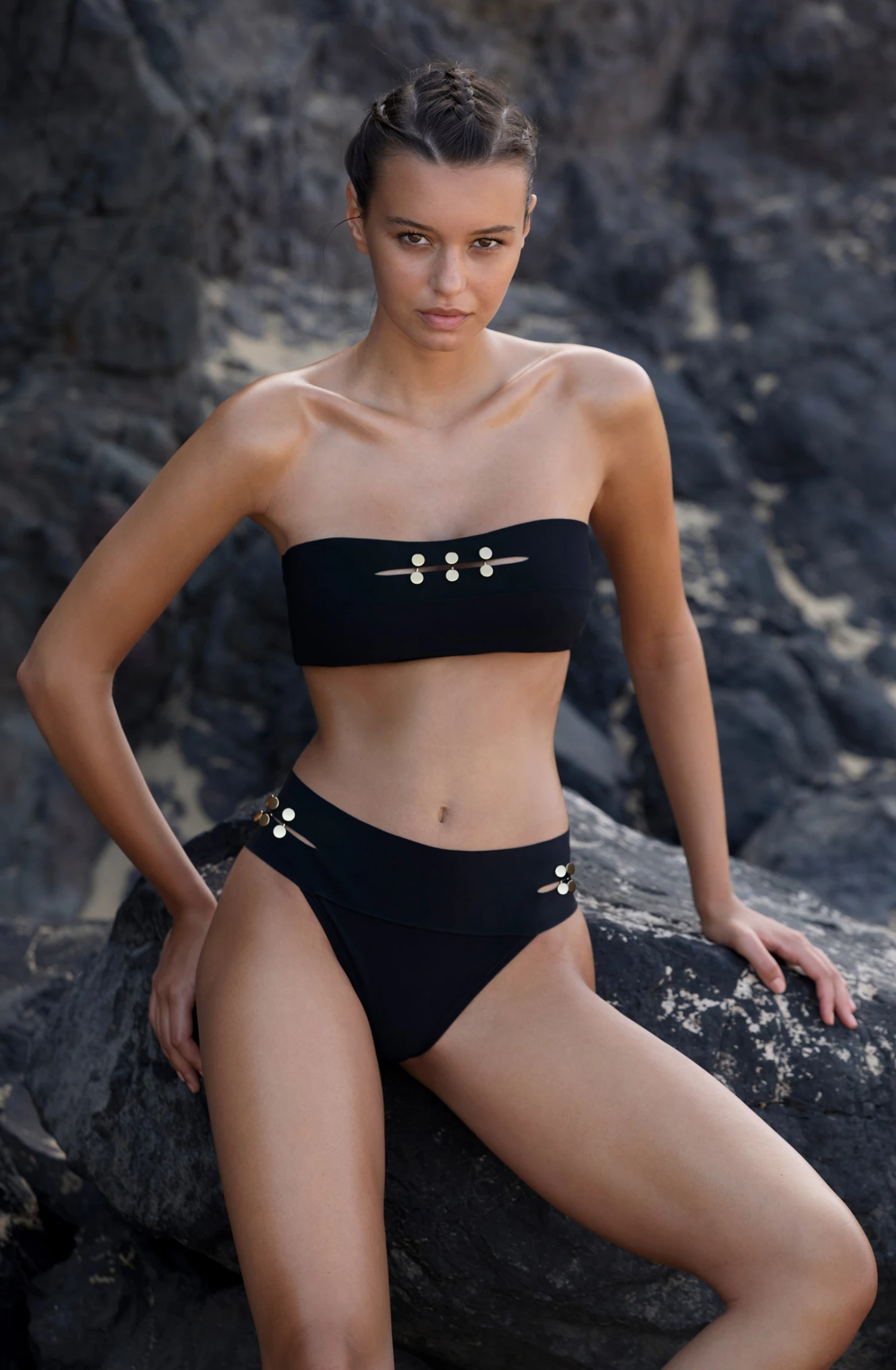 Avec ses boutons de manchette, la culotte de bain taille haute VINY promet d’attirer tous les regards. L’association avec le bandeau WAVE est un pur bijou. D’autres tailles hautes qui ne manquent pas de charme : TOBAGO noir ou WINA qui nous allonge la silhouette. On aime aussi cacher nos petits défauts sous la culotte gainante EMILIA. Pour dévoiler nos courbes avec un brin d’audace, on choisit le mono tanga SACHA noir.